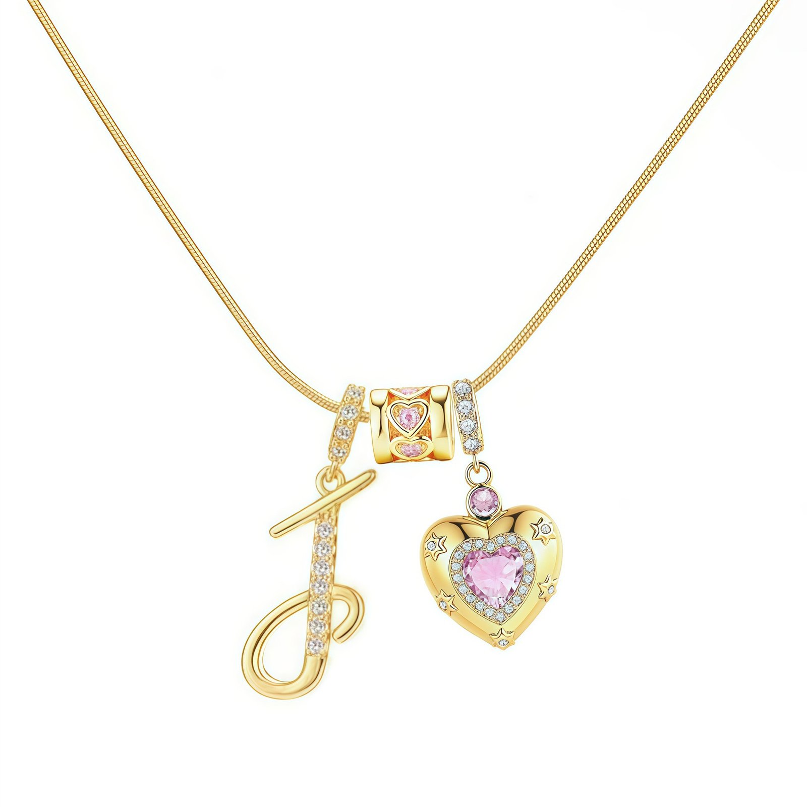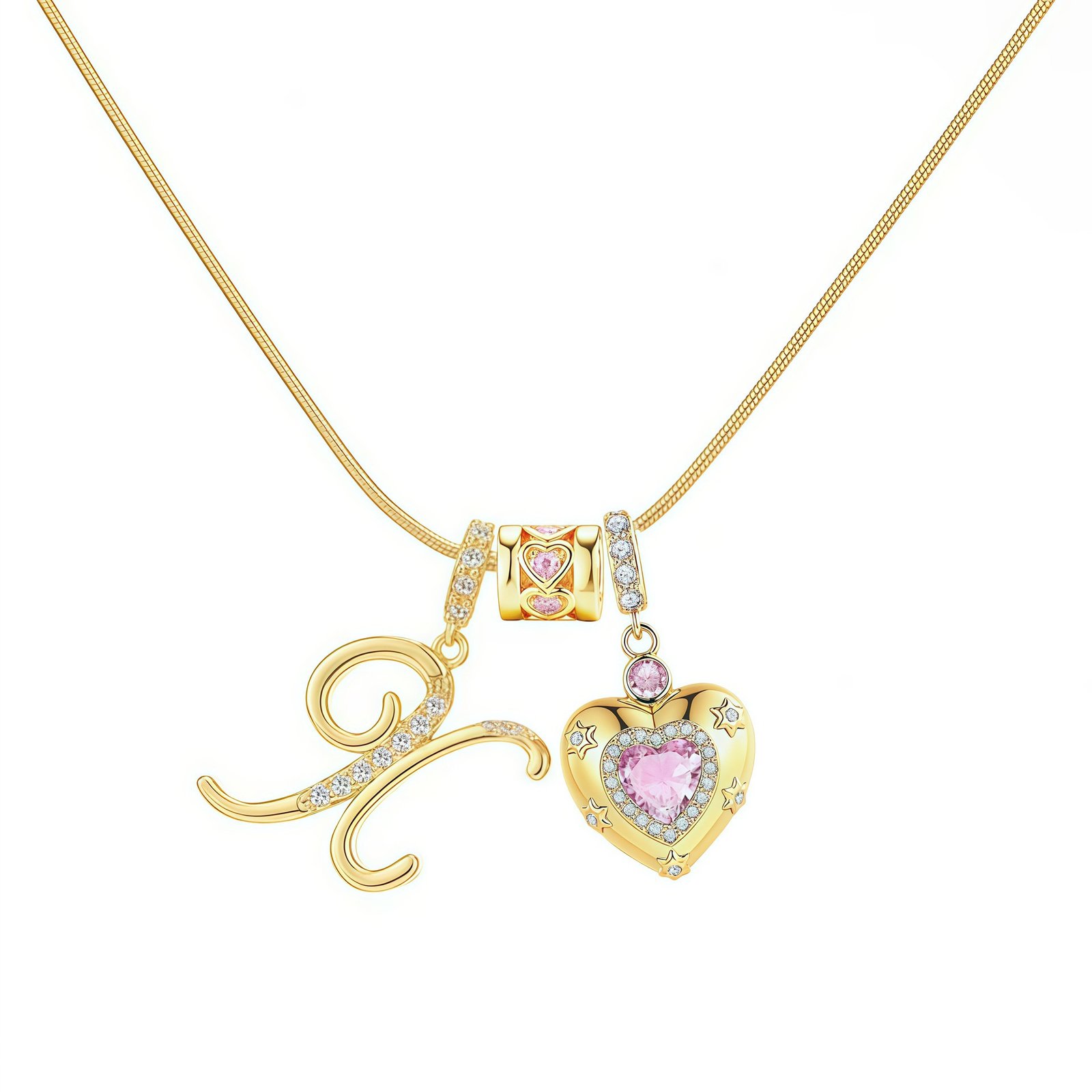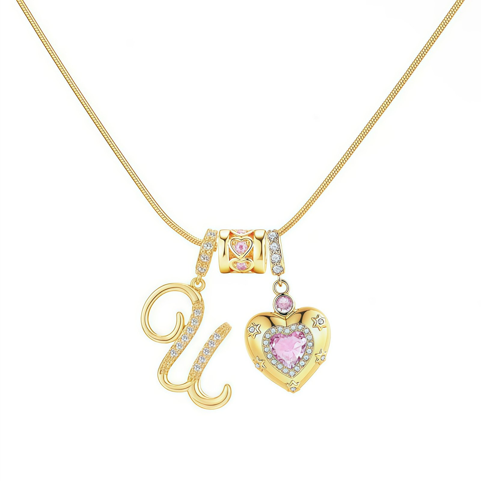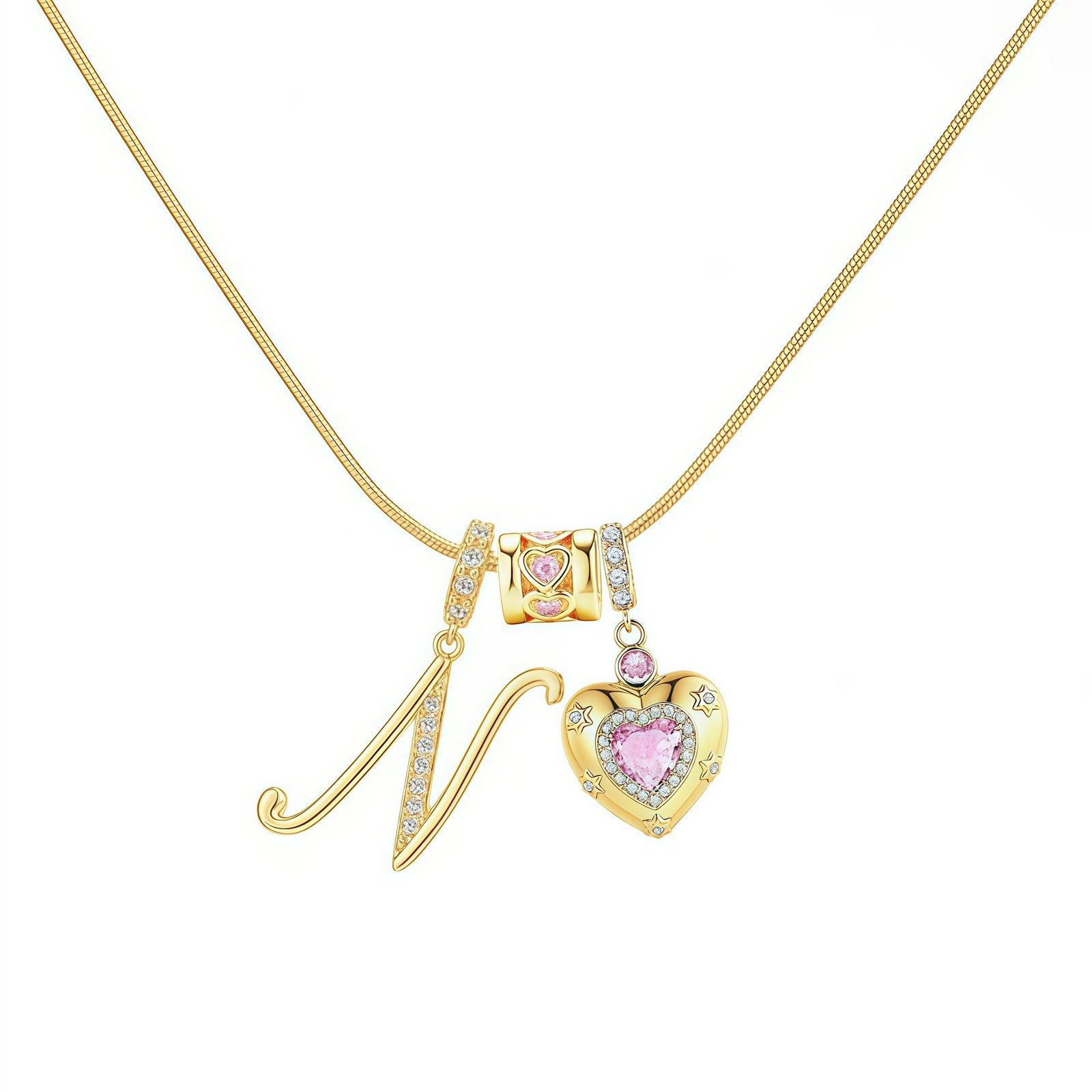 The Bella Whisper Gold Heart Letter Necklace is more than just a piece of jewelry; it’s a radiant celebration of love and individuality. Featuring a warm gold chain paired with a sparkling pink diamond heart, this necklace offers all 26 English letters for your selection, allowing you to engrave initials, secret codes, or personal symbols that resonate with your heart.