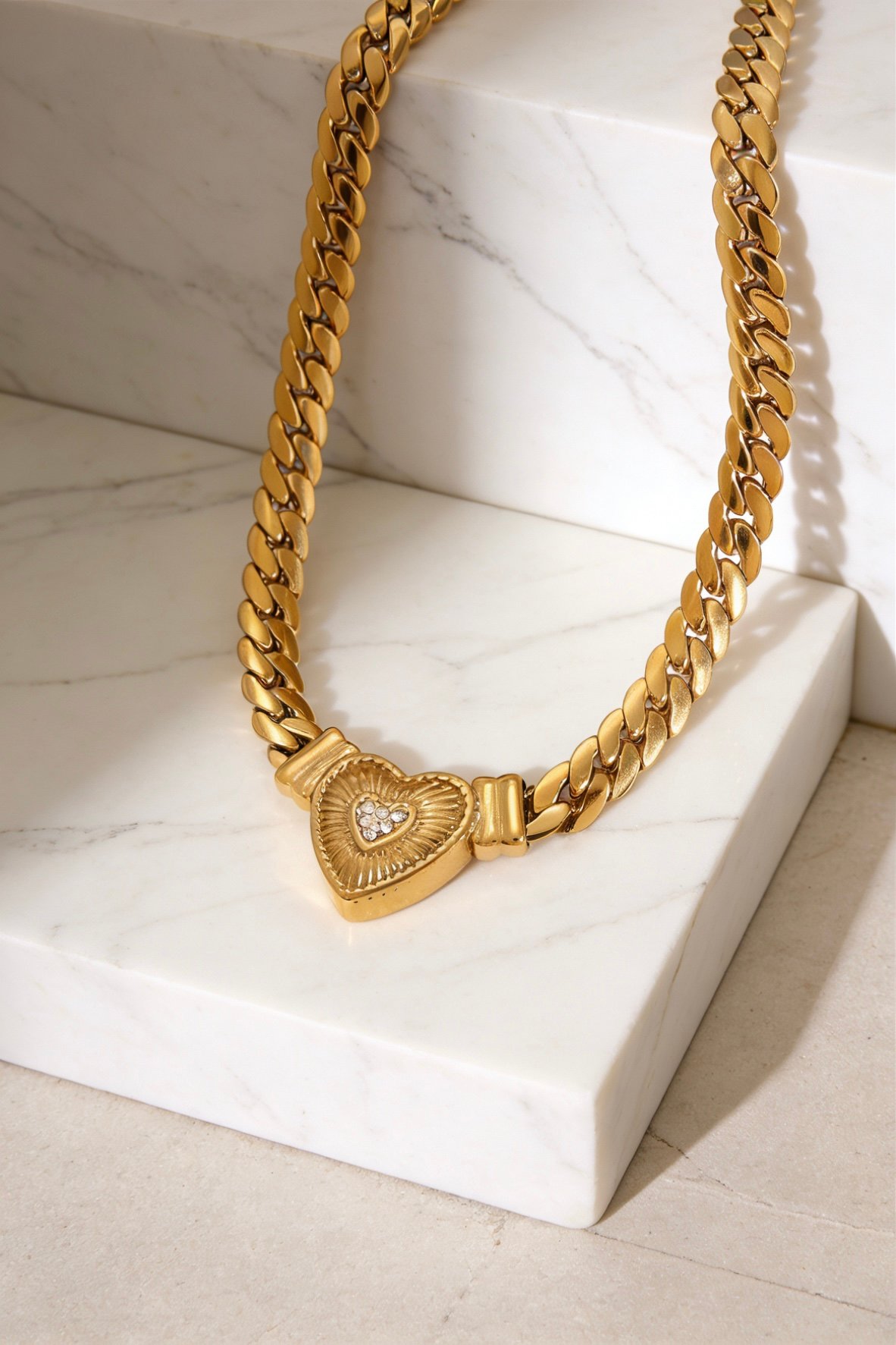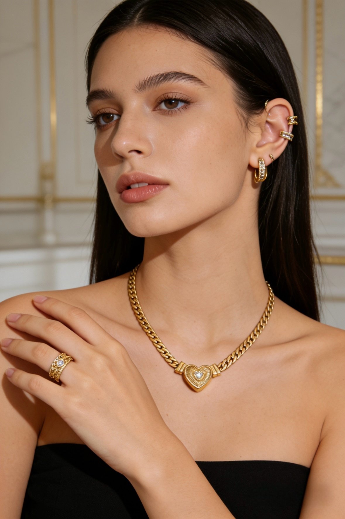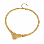 The Gold Heart Lock Choker combines a striking textured 18K gold chain with a diamond-studded heart pendant to create a captivating balance of strength and femininity. The choker style fits snugly around the neck, enhancing any outfit effortlessly. Whether paired with off-shoulder tops or casual wear, this piece elevates your look with its confident charm.