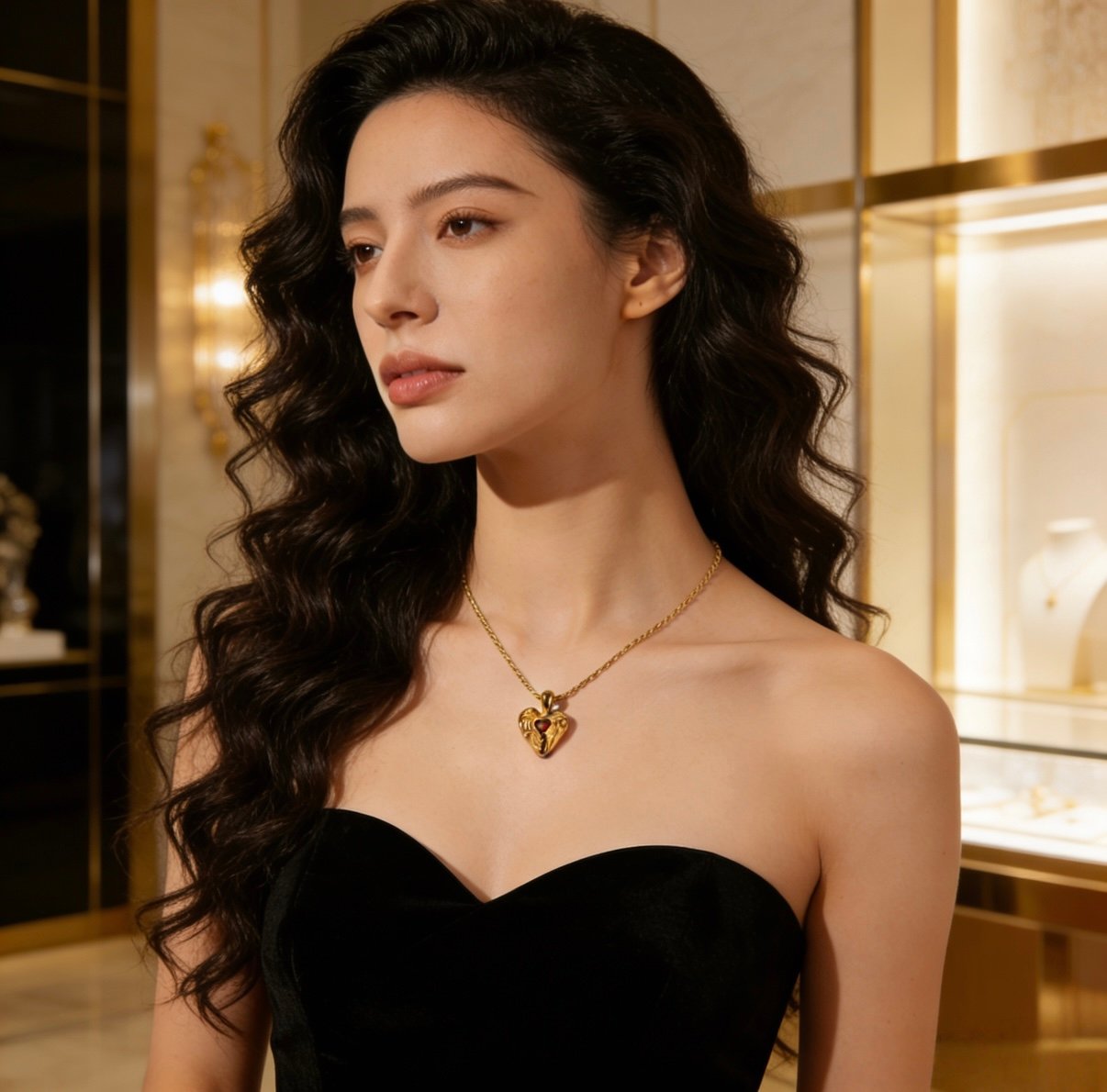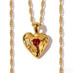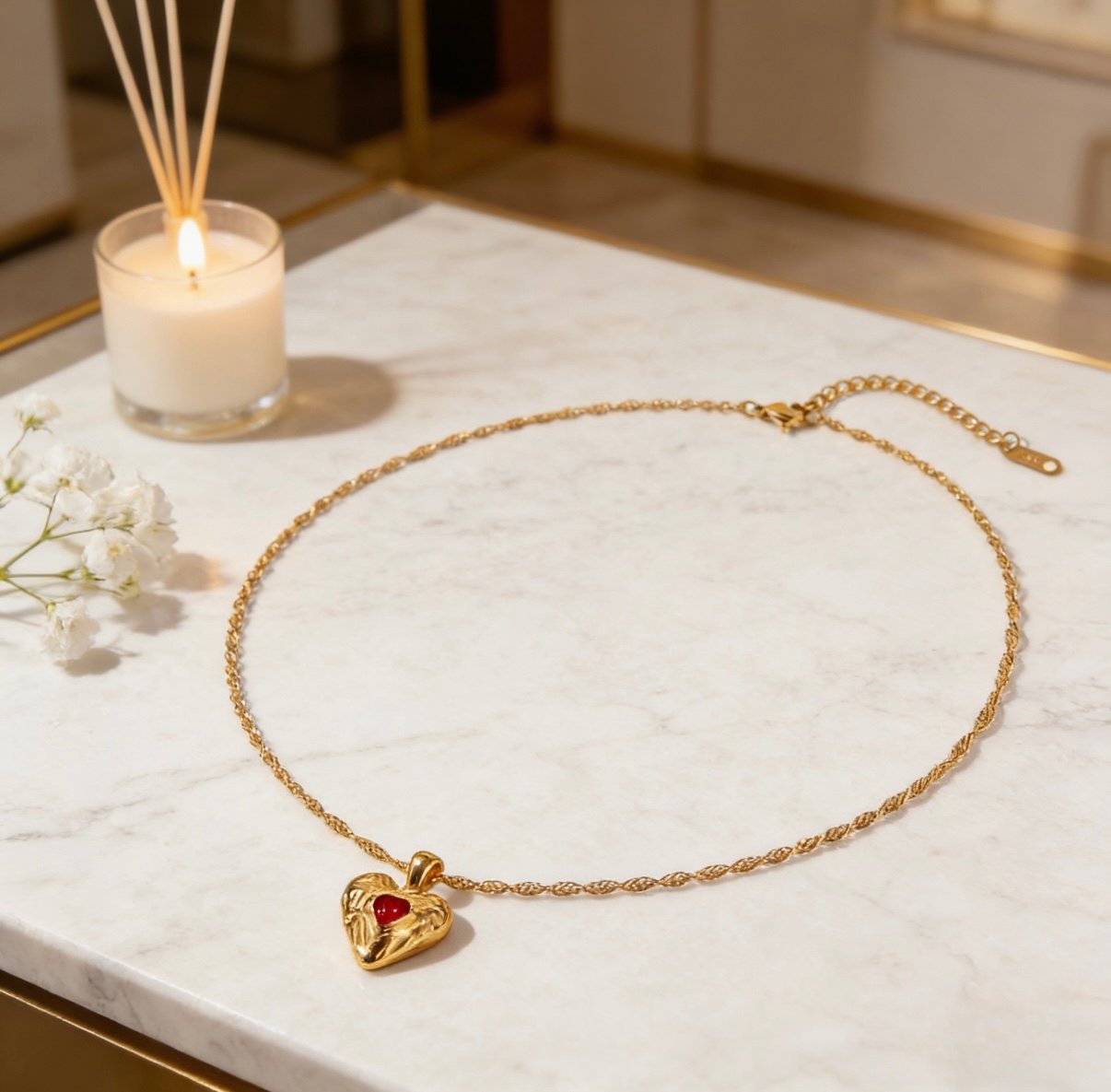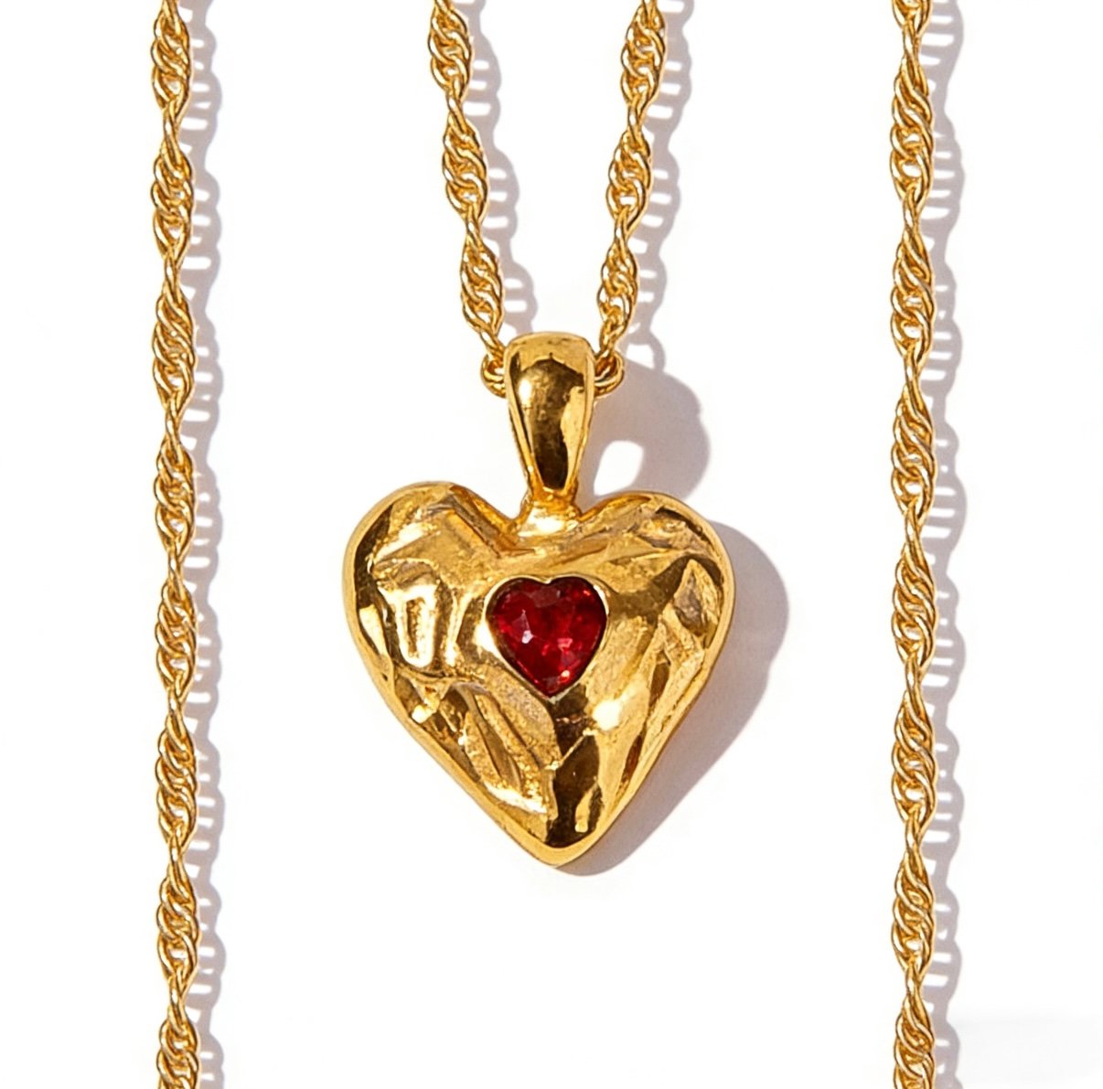 The Gold Heart Shadow Necklace features a matte 18K gold heart pendant embedded with a vibrant red zircon stone, perfectly complemented by a delicate chain that enhances the neckline’s grace. The vintage texture adds a unique quality to this heart design. This necklace is perfect for fashion enthusiasts seeking distinctive pieces that convey deep emotions.