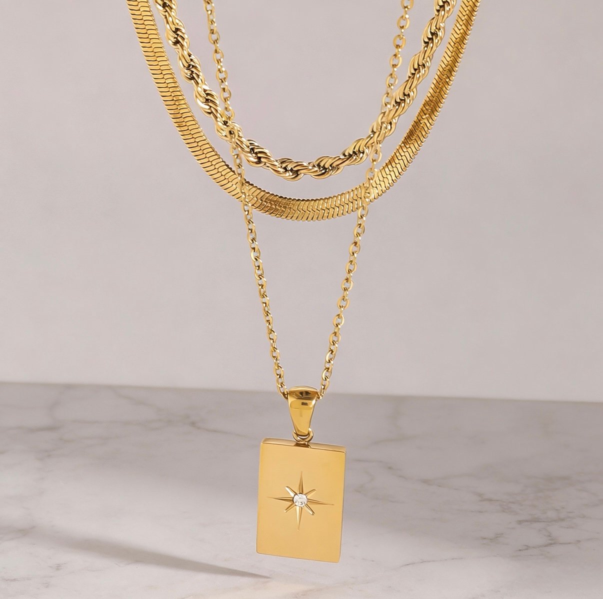 The Gold Star Charm Layered Necklace is more than just a piece of jewelry; it’s a stunning expression of style and sophistication. Featuring a beautifully intertwined design of snake chains, twisted links, and delicate strands, this necklace showcases a captivating square pendant adorned with a diamond starburst. Its rich texture adds depth, making it a versatile accessory for both casual and chic ensembles.